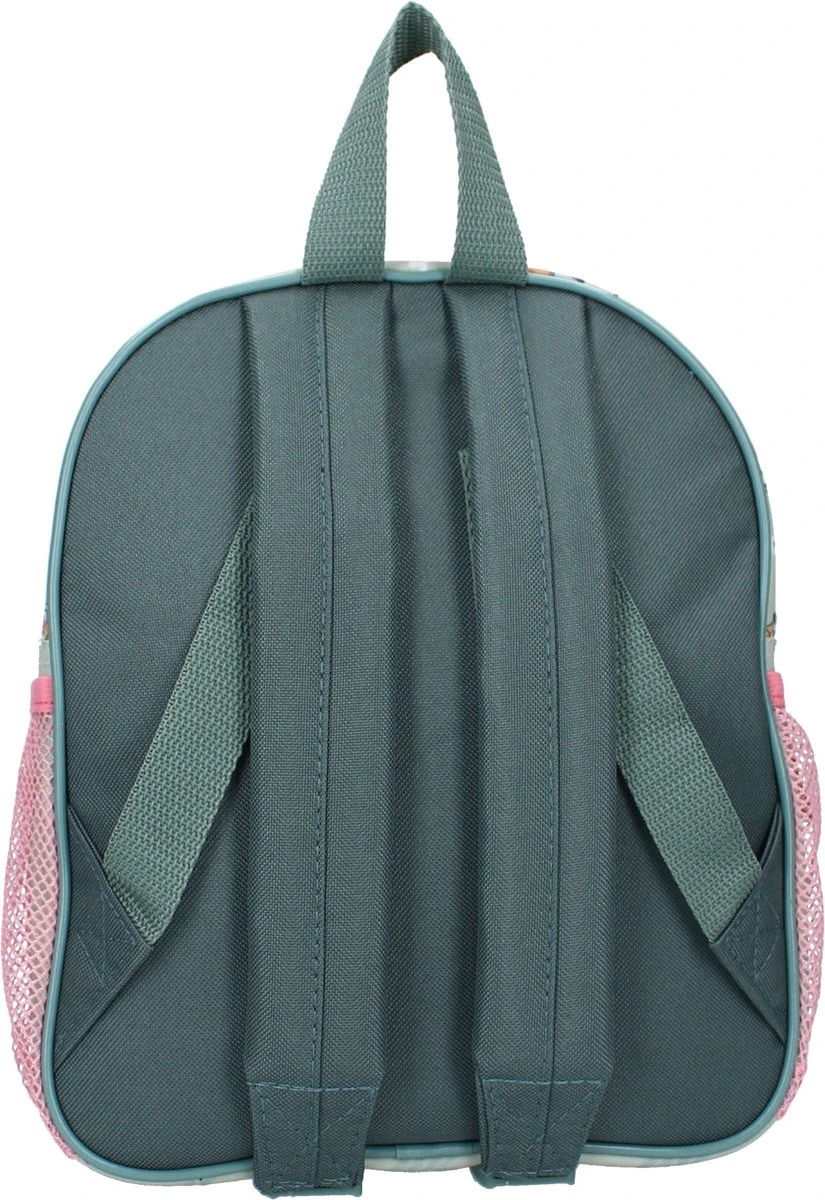 Deze schattige rugzak voor kinderen is voorzien van een subtiele groene kleur en is bedrukt met afbeeldingen van Bambi. Daarnaast is de tas voorzien van een bloemen print. Het voorvak biedt ruimte voor kleine spullen, zoals doekjes of haarspeldjes. De tas beschikt over twee vakken aan de zijkanten om eenvoudig een drinkbeker in de plaatsen. Het grote hoofdvak voorziet in ruimte voor kleding, lunchspullen of speelgoed. De schouderbanden zijn verstelbaar en de tas is afgewerkt met gouden details aan de rits en het logo.