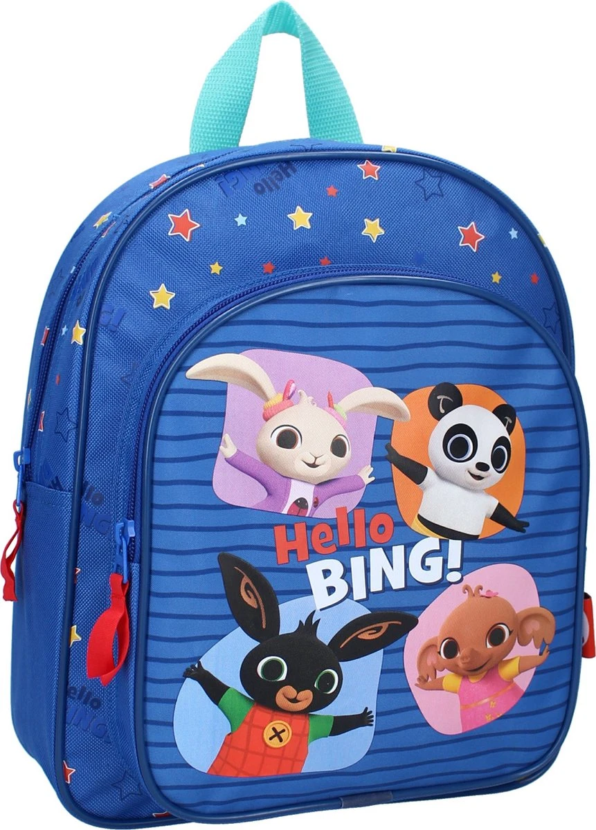 Alle Bing fans opgelet deze rugzak met Bing en zijn vrienden is een echte musthave! De blauwe rugzak met sterren details heeft een groot hoofdvak voor een extra setje kleding of een broodtrommel. Op het voorvak van de rugzak zijn Bing, Pando, Sula en Coco afgebeeld, in dit voorvak is genoeg plek voor kleine spulletjes. De gewatteerde schouderbanden zorgen ervoor dat de rugzak altijd goed zit bij jouw kindje.
