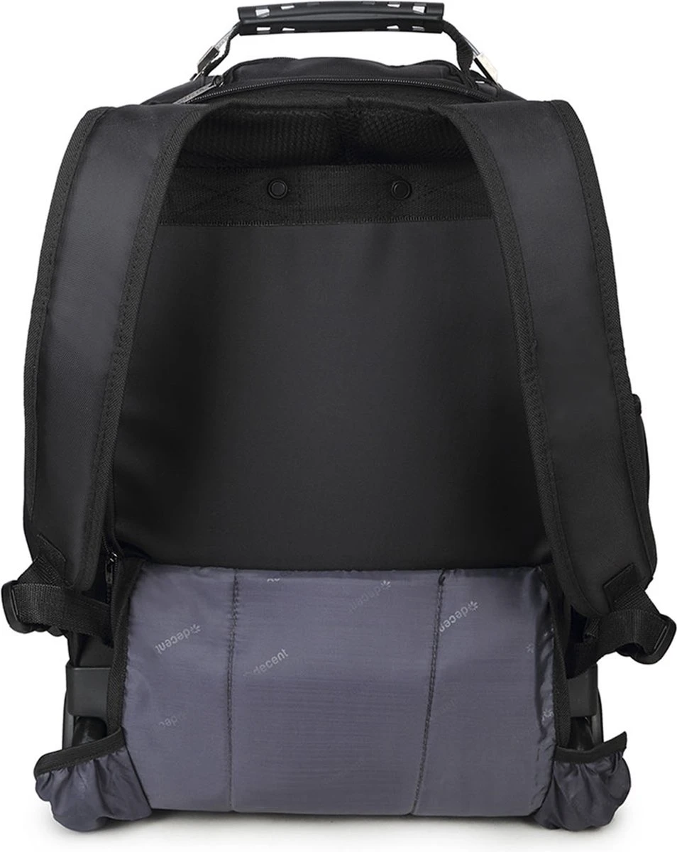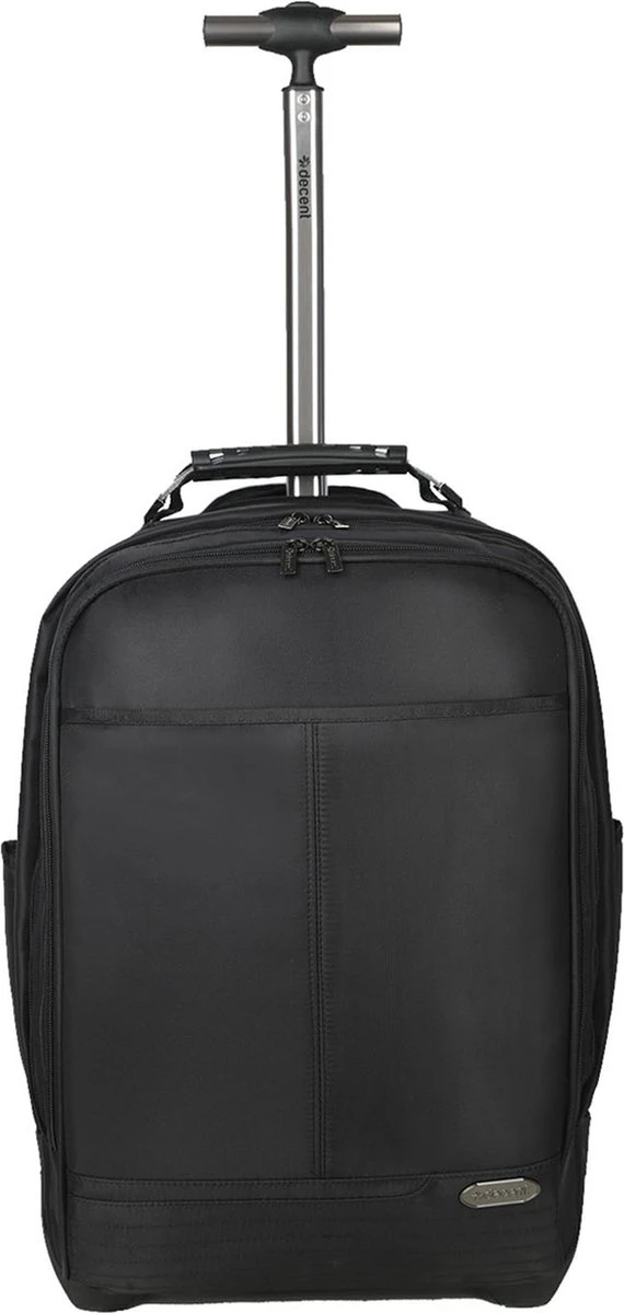 Handbagage formaat rugzak trolley uit de B-To Work serie van Decent. Kan als rugzak of als trolley gebruikt worden. De rugzak heeft 3 vakken met ritssluiting.