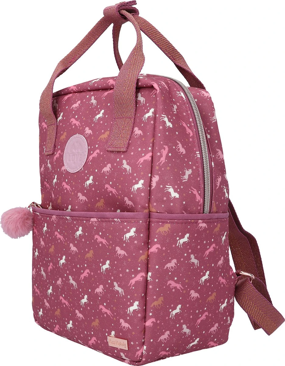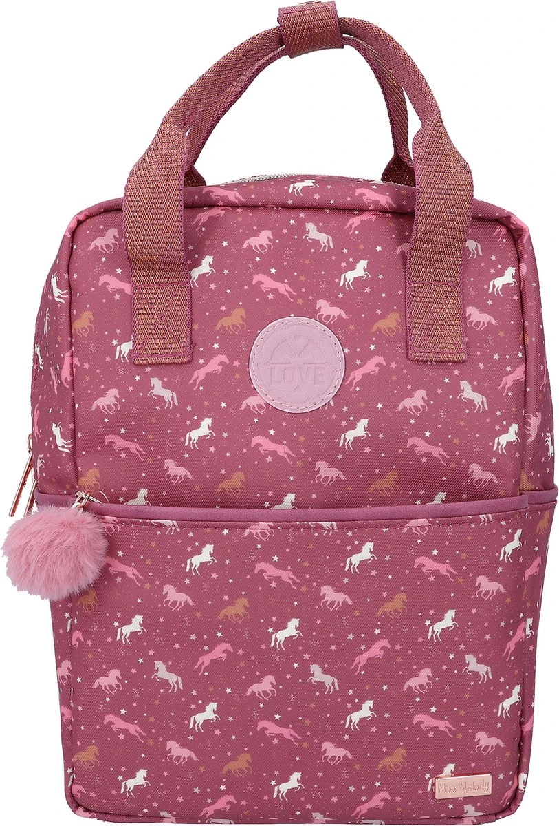 De rugzak WILD HORSES van Miss Melody heeft een mooie all over print. Met groot hoofdvak, apart vakje aan de voorkant, extra binnenvak met klittenband en karabijn en elastische loop voor een drinkfles. Materiaal: 100 procent polyester.