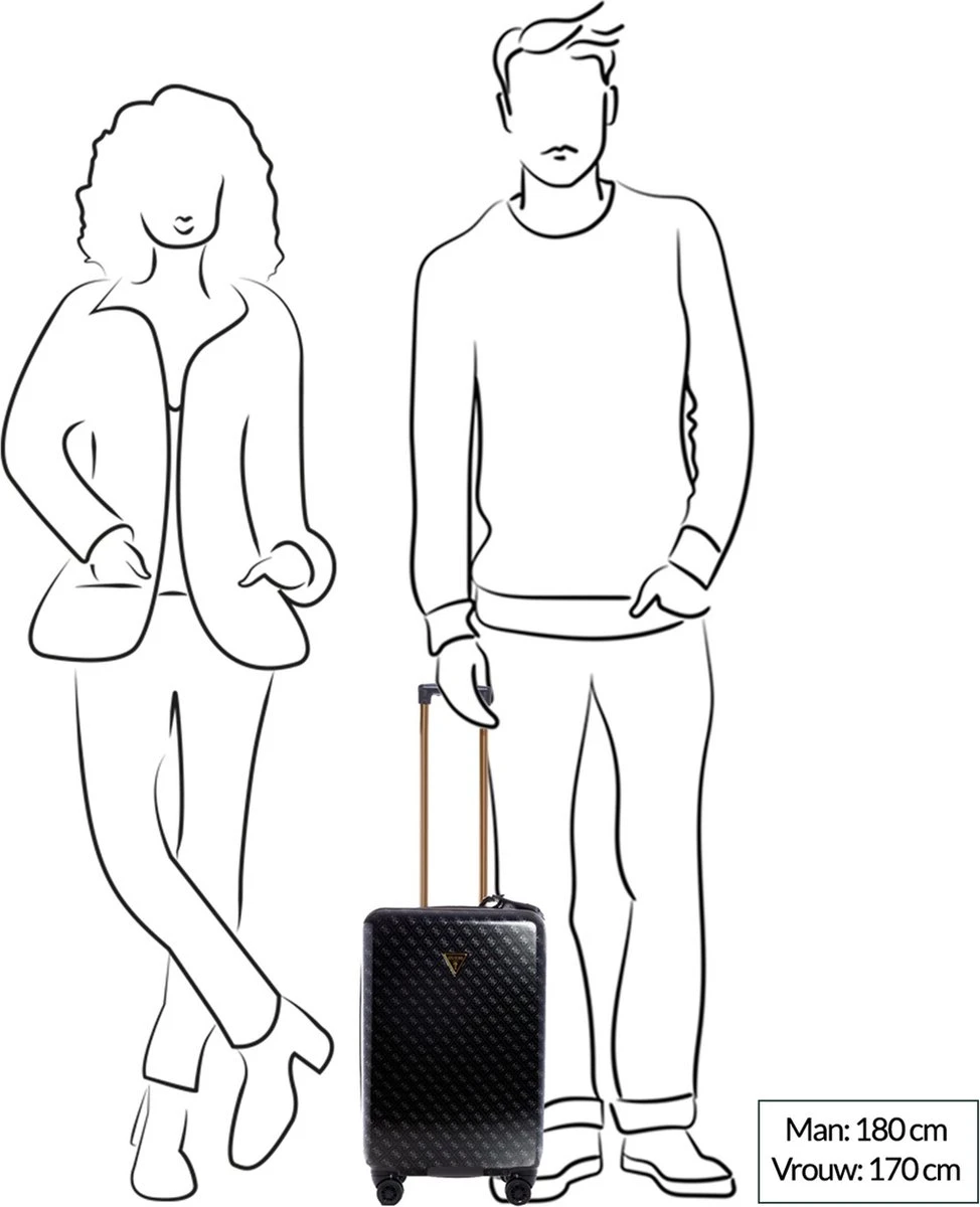 Handbagage heeft veel voordelen ten opzichte van ruimbagage. Het inchecken gaat sneller, omdat je op de luchthaven niet je ruimbagage hoeft in te checken. Deze Guess Jesco handbagage koffer is dan ook perfect voor jouw volgende reis. Ook bij aankomst op het vliegveld van bestemming hoef je niet te wachten op je koffer bij de bagageband. Zo kun jij dus eerder van je vakantie of citytrip genieten. Deze Guess koffer is voorzien van 4 wielen en wordt daarom ook wel een spinner koffer genoemd. Ten opzichte van een koffer met 2 wielen is een spinner koffer wendbaarder en kun je deze rechtop laten staan tijdens het vervoeren. **De ideale koffer voor een korte trip** Deze Guess handbagage koffer heeft een opslagcapaciteit van 38 liter. Deze koffer heeft hiermee genoeg ruimte voor een reis van twee tot drie dagen.**Bescherm je bagage met een harde koffer** Voor vliegvakanties is een harde koffer meestal de beste keuze. De inhoud van je koffer wordt perfect beschermd door de harde koffer. De koffer heeft geen vakken aan de buitenkant zodat je niet het risico loopt dat onbevoegden illegaal iets toevoegen aan jouw koffer, of er iets uithalen. Harde koffers zijn waterbestendig, waardoor je kleding en overige bagage droog blijven. Tenslotte is een harde koffer ook nog eens perfect schoon te maken na je reis.**ABS: krasbestendig en voordelig** Koffers gemaakt van ABS zijn krasbestendig, maar toch voordelig om te maken. Eigenlijk het ideale materiaal voor de niet frequente reiziger, die gewoon een goede koffer wil voor een voordelige prijs.**Voorzien van TSA slot** De koffer is voorzien van een TSA slot, waardoor je je koffer onbeschadigd aantreft op de bagageband. In de VS is een TSA slot verplicht, maar ook op veel andere luchthavens wordt een koffer met TSA slot aangeraden.**Geen chaos meer in je koffer** Omdat deze harde koffer is voorzien van inpakriemen in je koffer blijft je bagage tijdens je trip goed op z’n plek zitten. Je treft alles bij aankomst precies zo aan zoals je je koffer hebt ingepakt. De interne verdeler (tussenschot met rits) zorgt ervoor dat je bagage kunt verdelen over 2 compartimenten.