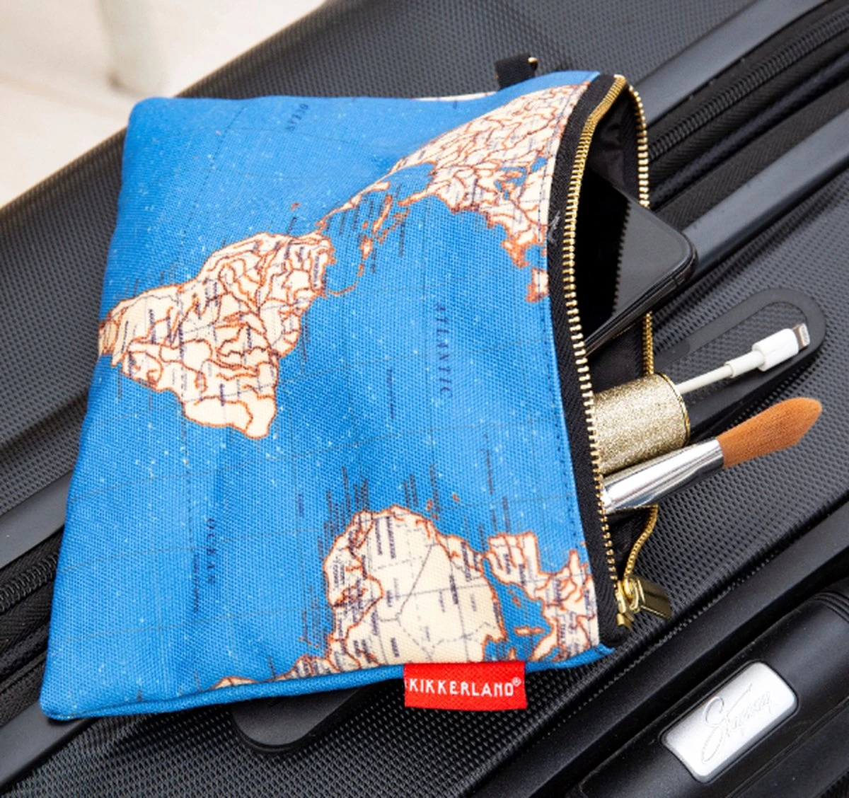 Reis in stijl en houd je spullen bij elkaar met de Reistas Wereldkaart van Kikkerland. Je kan de reistas is handig om bijvoorbeeld de toiletartikelen bij elkaar te houden in de koffer.