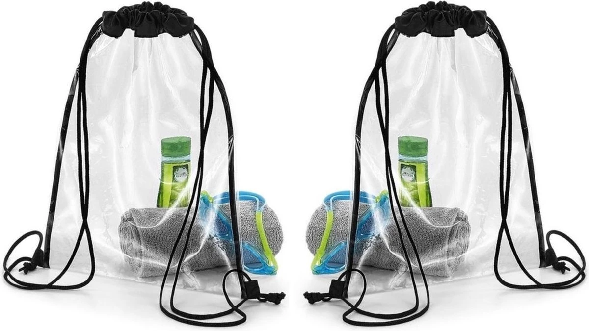 2x stuks transparante gymtasjes/rugtasjes/rugzakjes/zwemtasjes met zwart koord, geschikt voor kinderen en volwassenen. Afmeting: ca. 33 x 45 cm. Inhoud: ca. 11 liter. Materiaal: waterafstotend thermoplastic polyurethane (tpu). Doorzichtige rugtasjes voor o.a. festivals voor volwassenen.