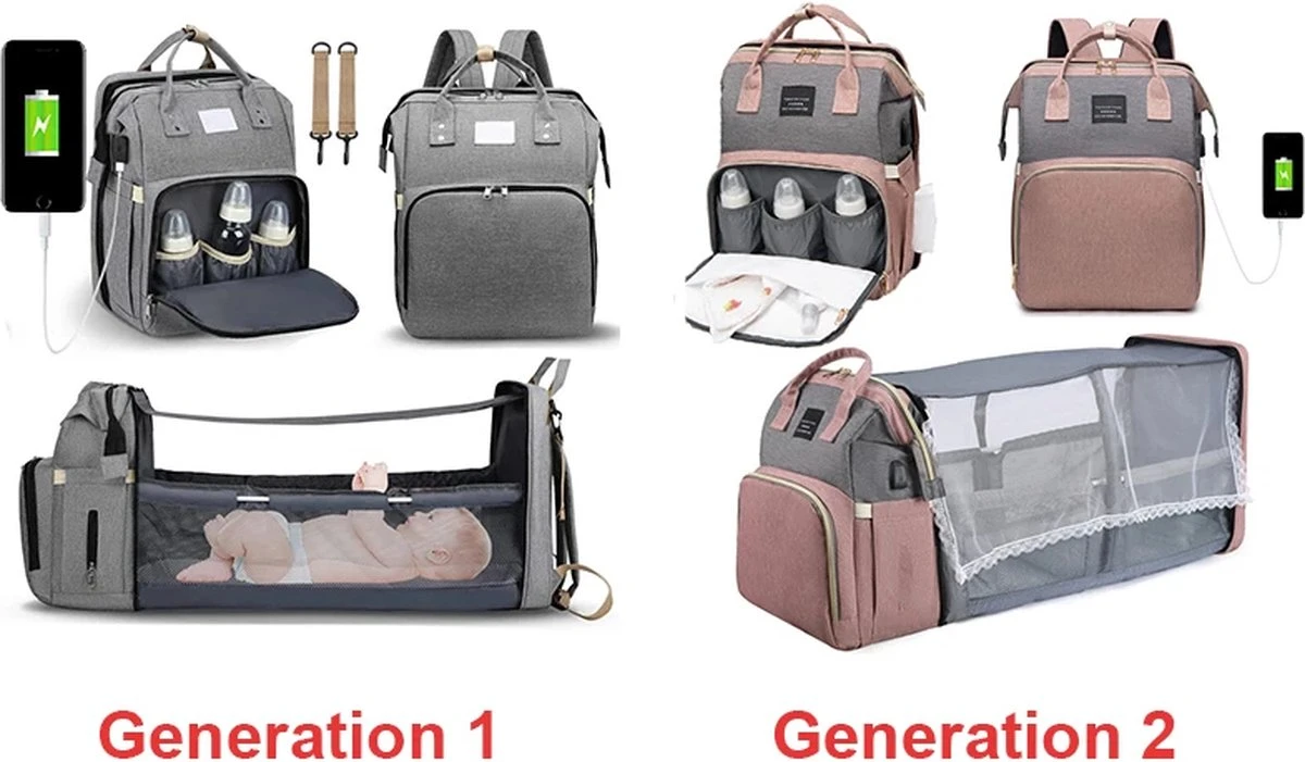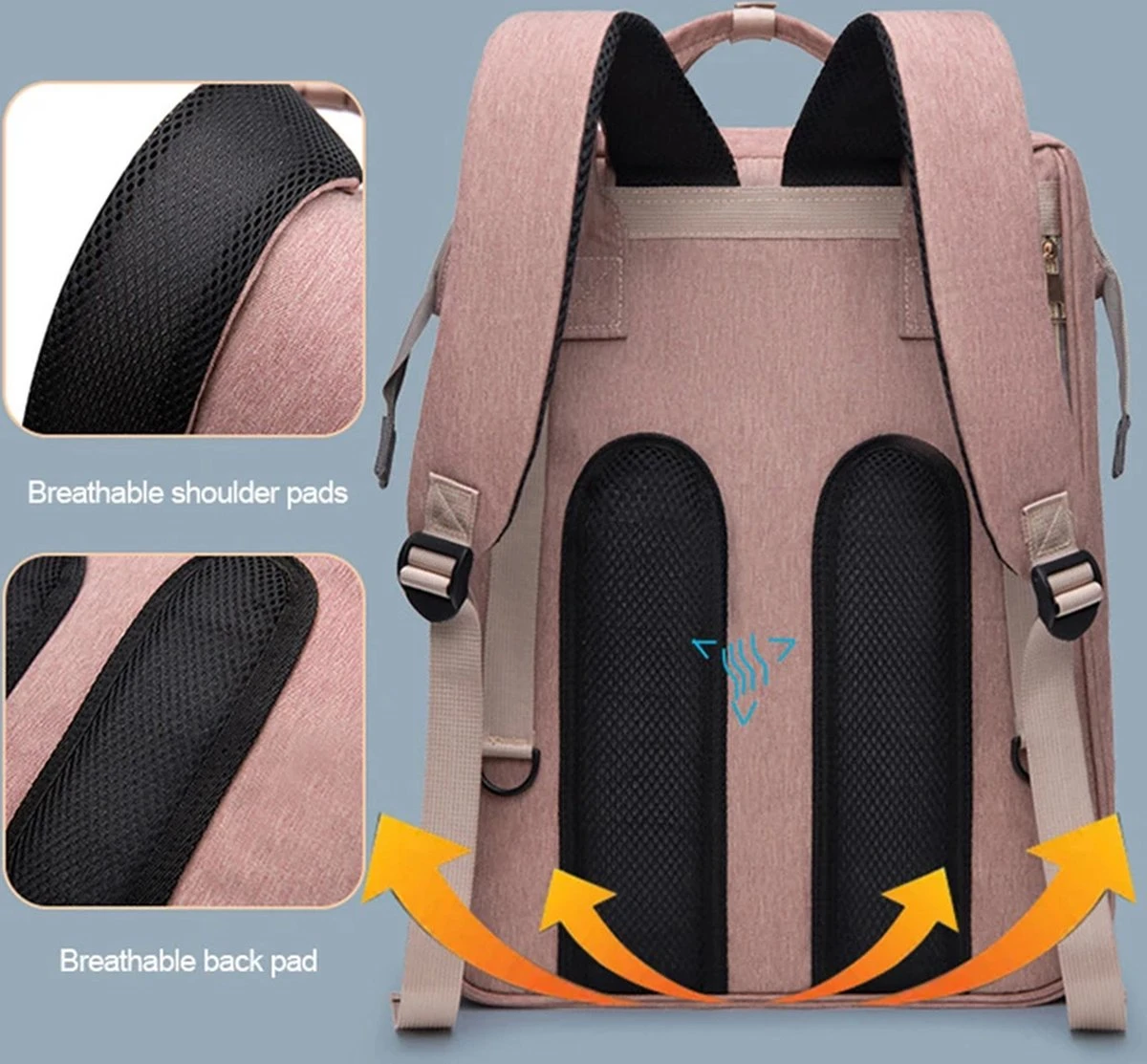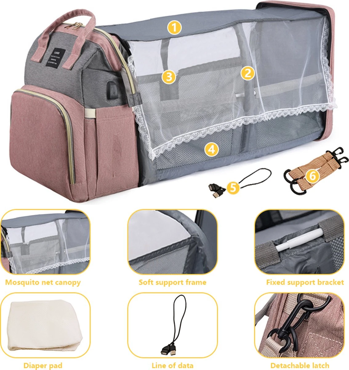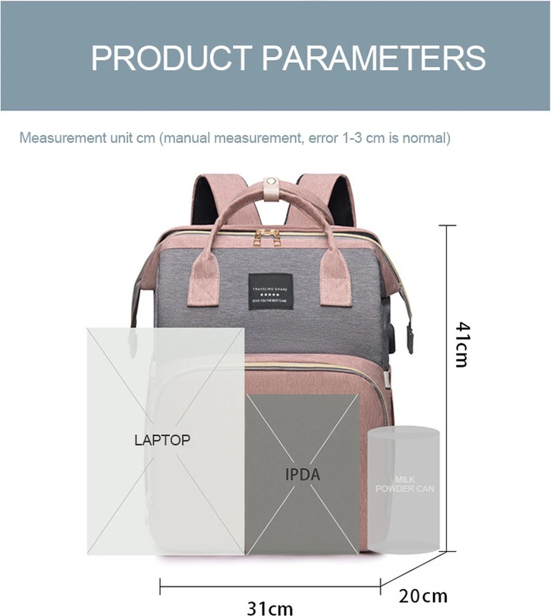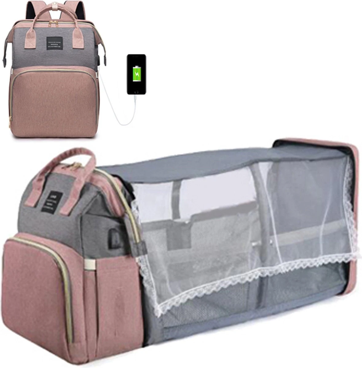 Merkloos Tas Voor Moeders En Vaders Met Uitklapbaar Baby Bedje – Draagbare Box – Rugzak Moeder – Roze – Met Veel Handige Opberg Vakken En USB Oplader – Klamboe – Mummy Bag – Verstelbaar