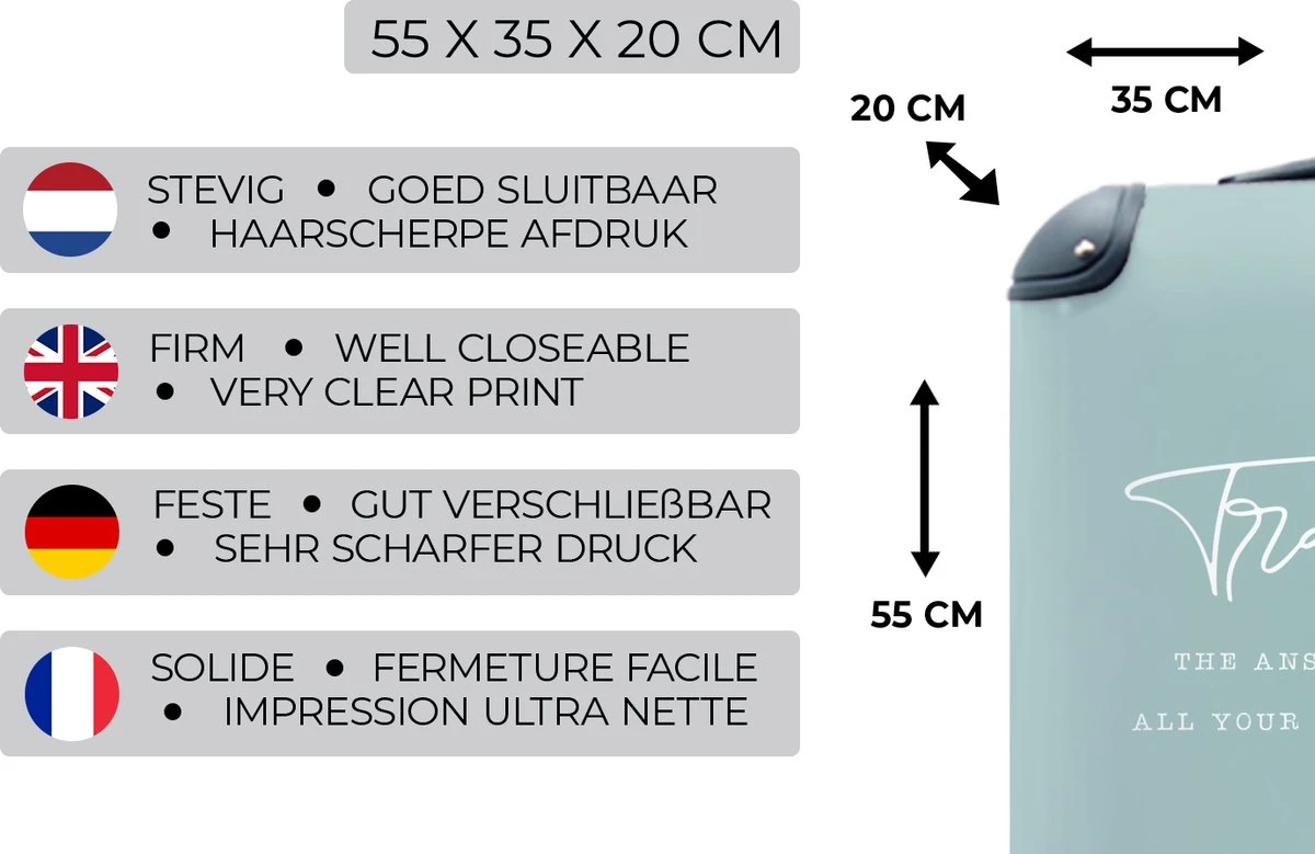 Ben je op zoek naar een hoogwaardige en trendy koffer welke ideaal is als handbagage tijdens jouw volgende reis? Dan is deze koffer van MuchoWow® een absolute must-have! De koffer is speciaal ontworpen met een transparante voorkant waardoor de print van je koffer nooit zal beschadigen. Daarnaast is het mogelijk om de print van de koffer te verwisselen. Ook beschikt het over een subliem afwerkingsniveau, wat resulteert in een modieuze uitstraling.