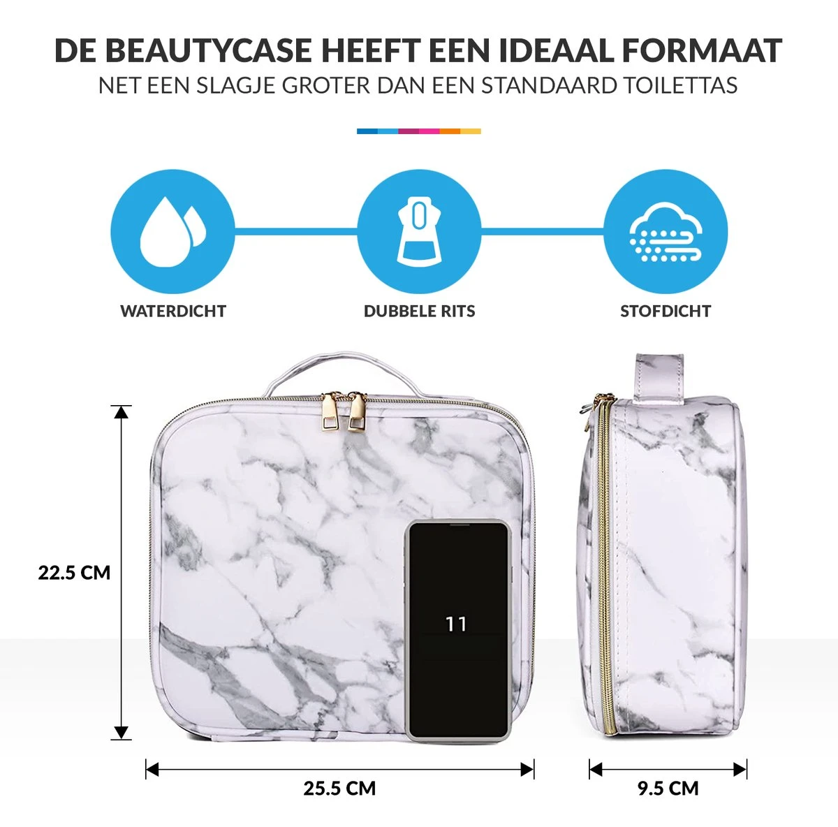 Deze gave beautycase heeft een ideaal formaat. Hij is namelijk net een slagje groter dan een standaard toilettas, maar neemt zeker geen halve koffer in beslag. De beautycase is gemaakt van hoogwaardig materiaal.