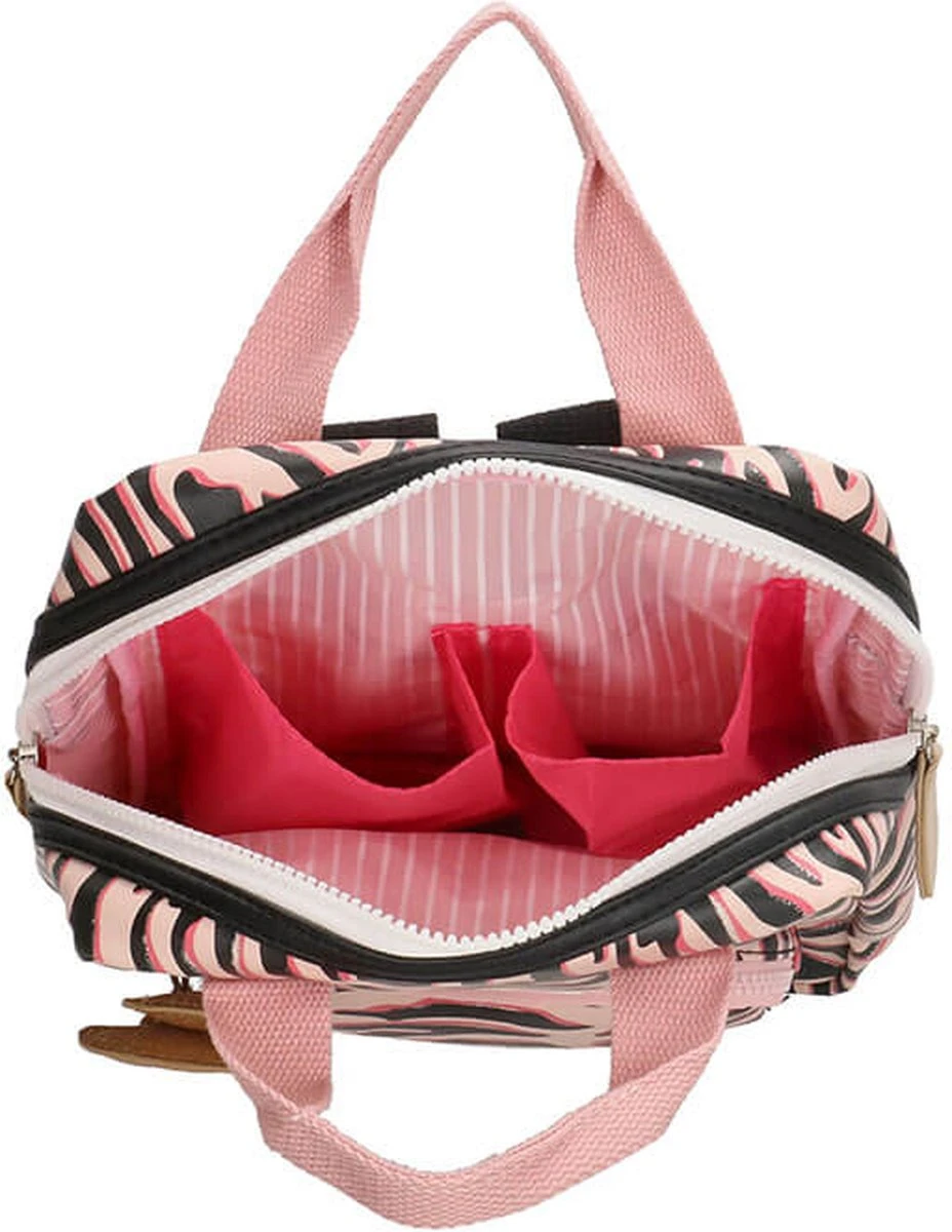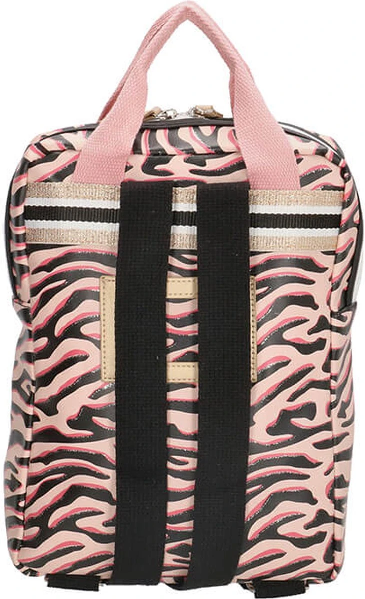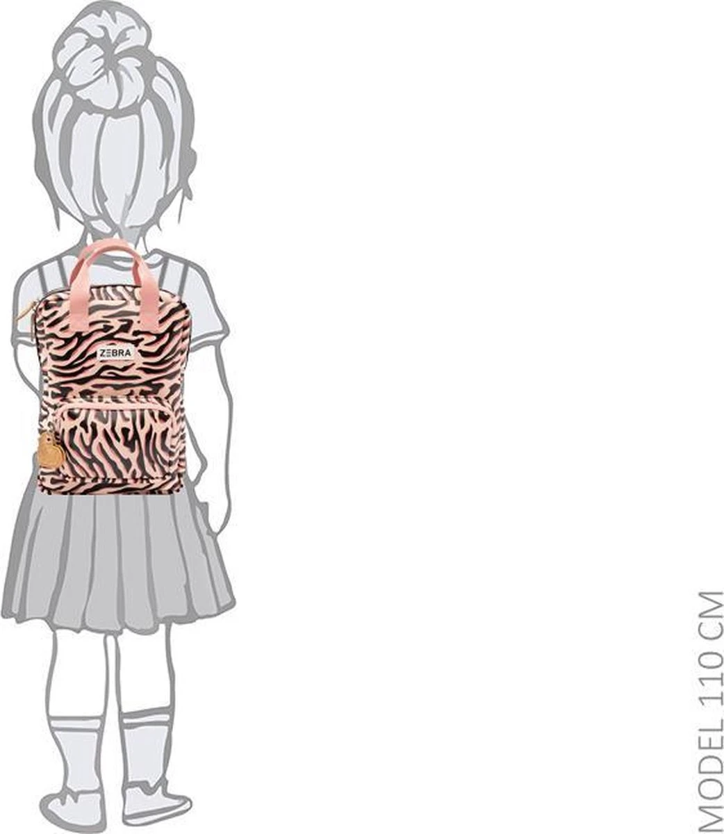 Voor de little-ones! Het kleine formaat rugzak in Zebra print met subtiel glitter randje. Voorop zit een extra opbergvak die sluit met een rits en gouden glitter hartje. De gehele tas sluit met een stevige blokrits met dubbele sluiting in zwart-wit. De rugzak is te dragen dmv roze canvas hengsels en zwarte canvas schouderbanden. Binnenin bevinden zich 2 drinkbeker vakken en een vrolijke licht roze gestreepte voering. Het handige naamlabel zich achterop de tas.